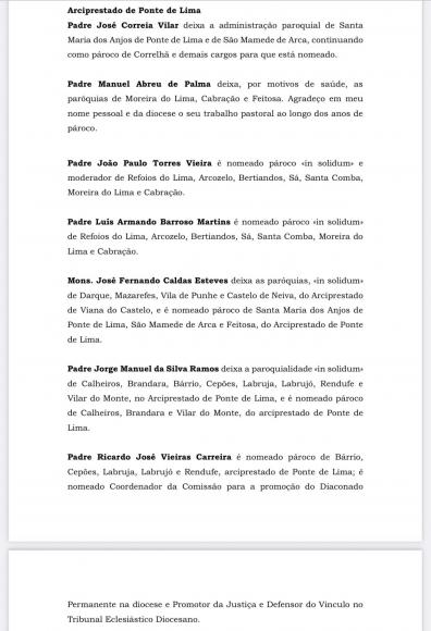 Mons. José Fernando Caldas Esteves é nomeado pároco de Santa Maria dos Anjos de Ponte de Lima, São Mamede de Arca e Feitosa, do Arciprestado de Ponte de Lima.